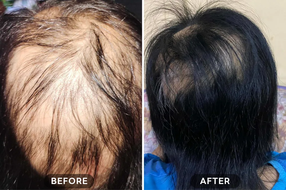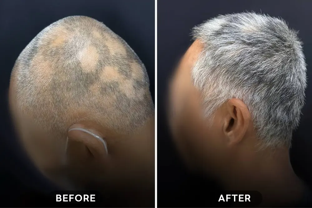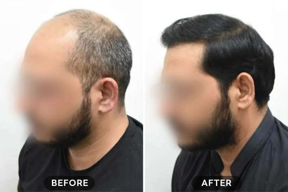 (After) Follow-up photograph obtained after hair transplantation shows marked improvement in hair density, with restoration of frontal hairline contours, increased coverage in the frontal and mid-scalp regions, and a visibly fuller and more uniform scalp appearance compared with baseline.